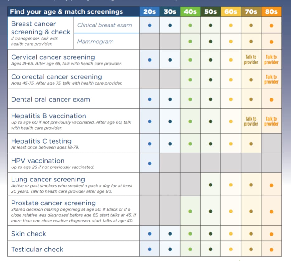 2. https://www.cancer.org/cancer/screening/screening-recommendations-by-age.html